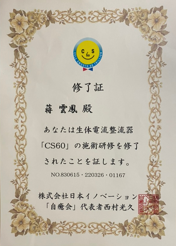 21年に中国より来日し、夫と共に山形県河北町に移住。そこで知人がCS60の施術を受けるところを目の当たりし、自身もCS60を学ぶことを決意。夫と共に農業に従事する傍ら、開発者西村氏の元で研修し、CS60クリニック CS60山形 ともも園を開業。